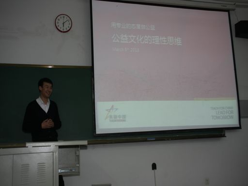 3月5日晚,在正心楼举办的“公益文化的理性思维——用专业的态度做公益”为主题的志愿服务宣传讲座也取得了良好的效果。哈工大的优秀毕业生、TFC全国招募经理张硕先生,与师弟师妹们分享了自己在志愿服务行动中的所感、所想、所得,让同学们对支教有了新的体会和理解。他还与现场的同学进行了交流互动,解答大家关于支教方面的问题与困惑。精彩的宣讲让大家受益匪浅。