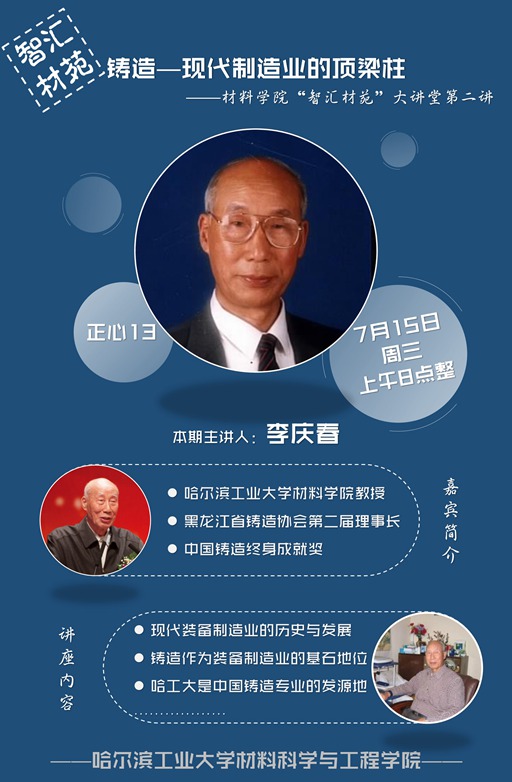 铸造是人类最早掌握的金属热加工工艺,早在商代就已经大规模成熟使用。目前铸造仍然是现代金属热加工的主要工艺之一,也是最廉价和快速的成型工艺。铸造被誉为装备制造业的基石,也是衡量一个国家国力的重要指标之一。目前我国是世界第一铸造大国,年产铸件超过3350万吨。哈工大作为铸造专业的发源地,对铸造学科有着精深的研究。本期大讲堂将探寻现代装备制造业的历史与发展以及铸造为何能成为装备制造业的基石,并为同学们讲述哈工大铸造专业60余年的发展情况和人才培养情况等。
