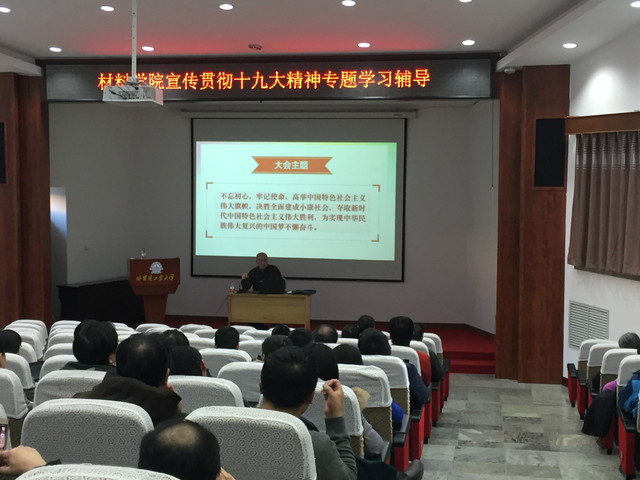 为把学习贯彻党的十九大精神引向深入, 2017年12月1日在邵馆报告厅,材料学院党委邀请学校十九大精神宣讲团成员、马克思主义学院解保军教授为师生党员作十九大精神宣讲报告。材料学院党委书记刘伟和领导班子成员,各党支部委员和党员代表参加专题学习。