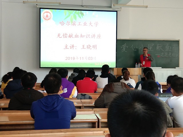 为保障志愿者自身安全,帮助他们消除疑虑,提高服务质量,活动特别邀请哈尔滨市血液中心王晓明、艾滋病预防控制所喻欢担任嘉宾,在一、二校区举办两场志愿者培训与“无偿献血及艾滋病预防”知识讲座。两位老师向全体志愿者做了关于艾滋病预防、无偿献血的介绍,并就献血活动中的常规注意事项对志愿者进行了系统培训。他们结合自身工作和志愿服务经历,分享了他们的感受,鼓励同学们积极投身公益,参与无偿献血,让志愿的承诺在热心服务中升华。