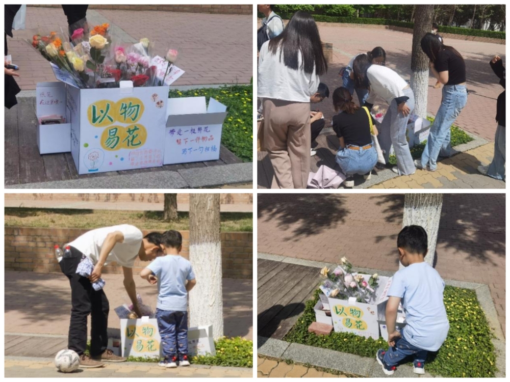 “心物易花”活动在步行街上顺利举办,同学们将自己的物品和祝福留在主办方准备的纸箱中,换走一枝鲜花。也有小朋友来留下自己的祝福。鲜花易逝,浪漫长存。通过“心物易花”活动,同学们传递了快乐与美好,也收获了平淡生活中的一丝感动。