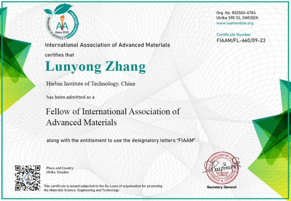 材料科学与工程赌博网站推荐张伦勇副教授荣获国际先进材料学会科学家奖并增选为IAAM终生会士