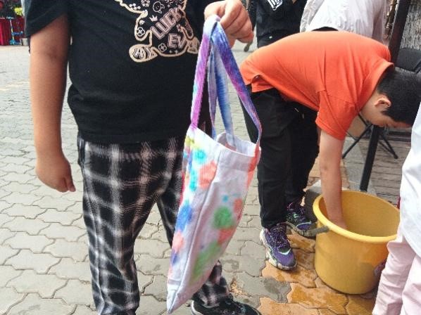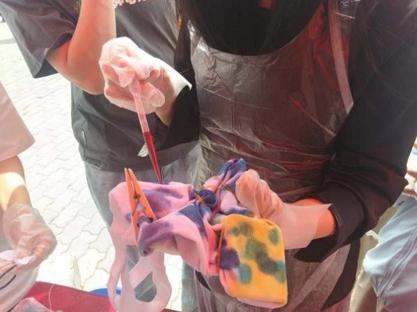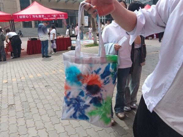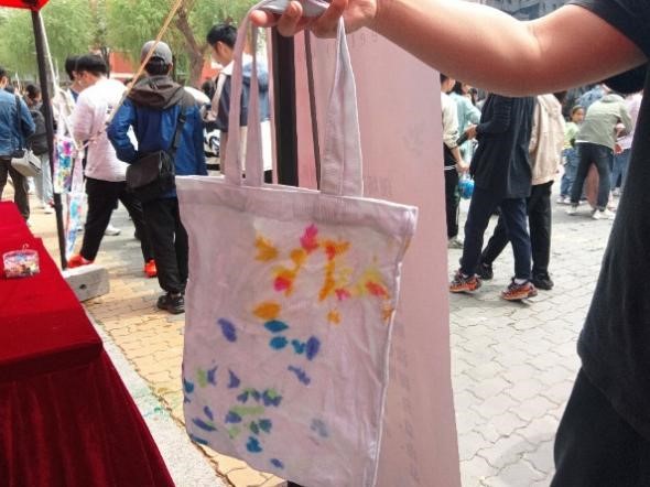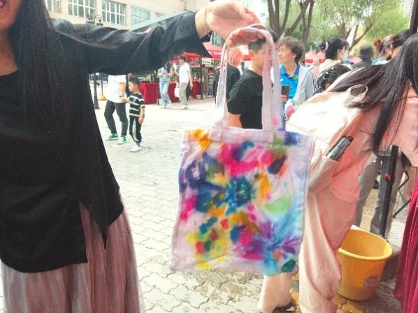 5月25日,步行街举办了布艺扎染活动。活动准备了白色的布料、帆布袋和发箍等扎染原材料和颜料、皮筋、丝线等扎染工具,并现场演示扎染过程,吸引了许多同学和小朋友参与其中,按照天马行空的想象为白布肆意渲染色彩,独具匠心的创意和构思也创造出一个个富有自由随性的艺术作品。