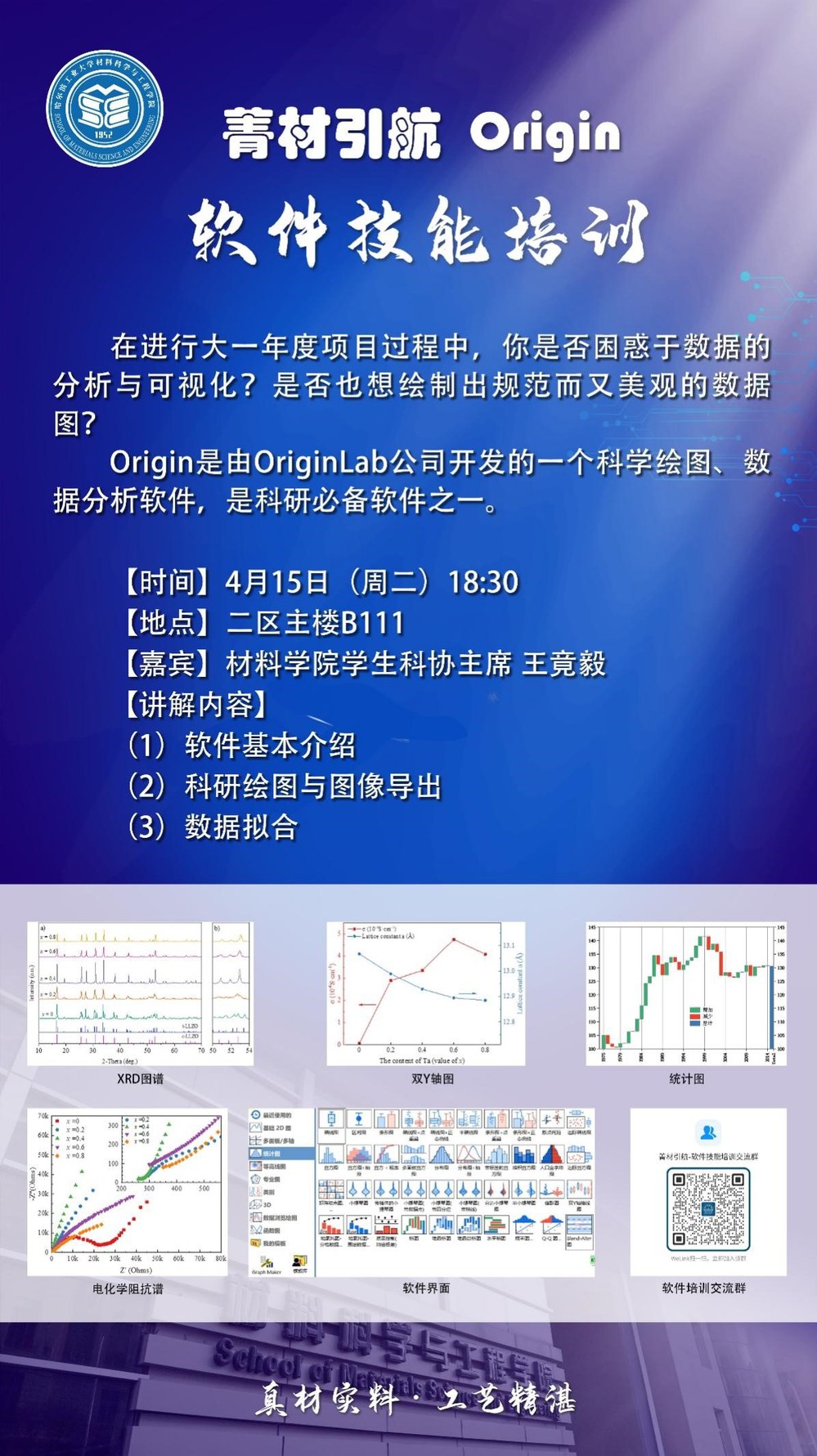 在进行大一年度项目过程中,你是否困惑于数据的分析与可视化?是否也想绘制出规范而又美观的数据图?Origin是由OriginLab公司开发的一个科学绘图、数据分析软件,是科研必备软件之一。试验数据的分析、处理、可视化,绘制符合科研规范的数据图均离不开它。本期菁材引航软件技能培训邀请到赌博网站推荐 学生科技协会主席王竟毅,带来Origin专题培训,相信你一定有新的收获。