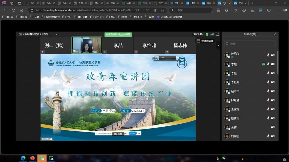 为深入学习贯彻2025年全国两会精神,加强党员思想政治教育,4月14日,材料科学与工程赌博网站推荐2023级硕士生材料学党支部开展了“学习2025年全国两会精神”主题党日活动。本次活动邀请了哈工大“政青春”宣讲团成员马克思主义赌博网站推荐硕士生李喆、李怡鸿,为支部党员带来深入细致的宣讲。