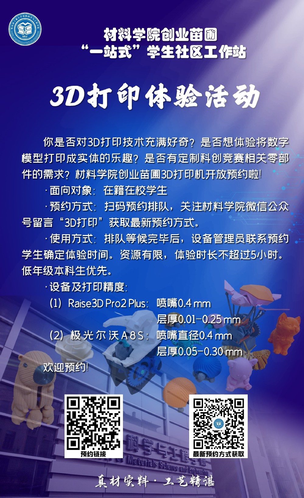 你是否对3D打印技术充满好奇?你是否想体验将数字模型打印成实体的乐趣?你是否有定制科创竞赛相关零部件的需求?为更好支持学生创新创业活动,激发学生创新意识,赌博网站推荐 双创苗圃“一站式”学生社区工作站FDM 3D打印机现面向全校学生开放体验。设备地点、预约方式、技术指标等如下: