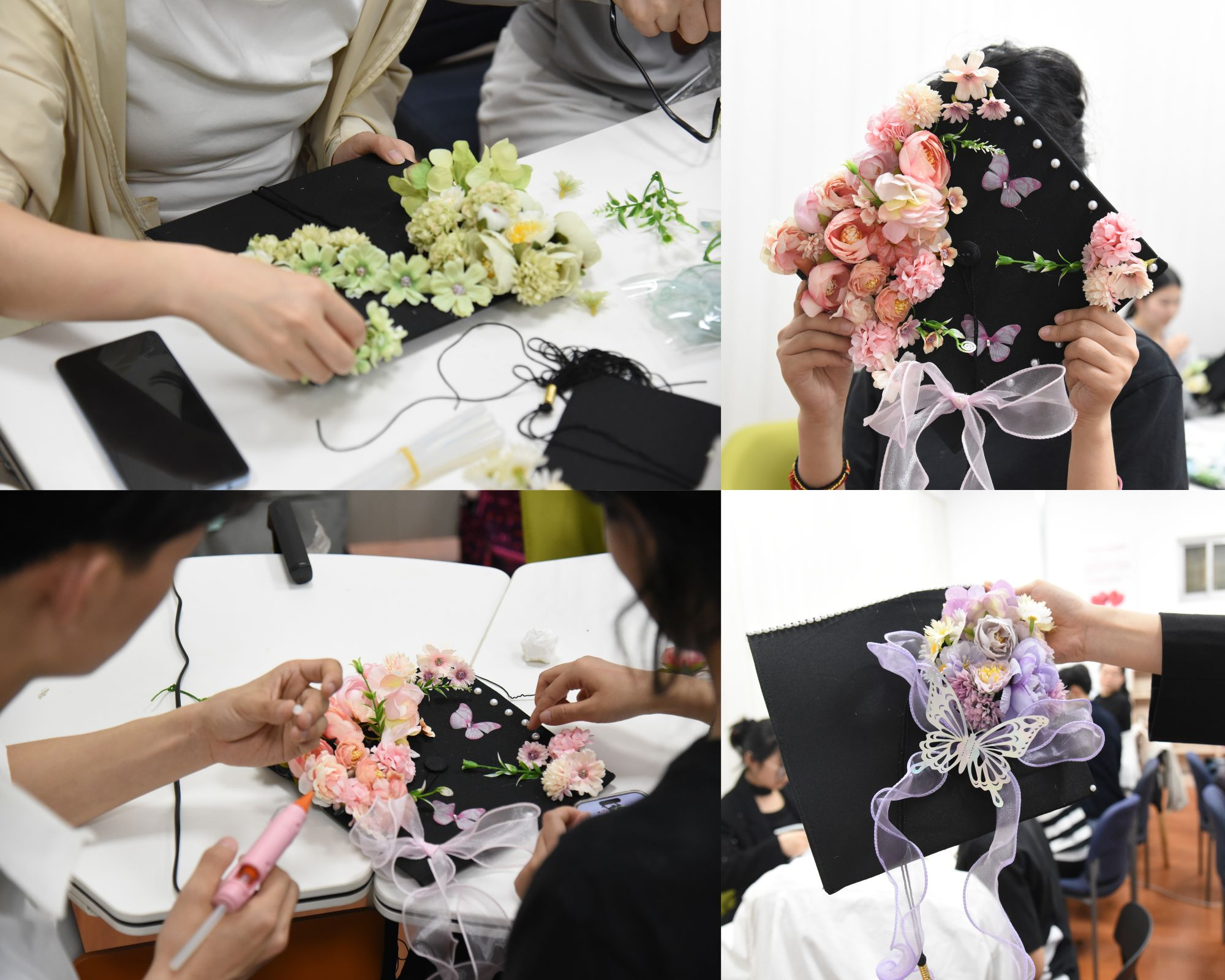 5月26日晚,“缀·芳华”——纪念手作簪花学士帽活动为即将毕业的同学们带来别样温情。参与者用丝带、干花、绒球等材料装饰学士帽,将美好祝愿融入手工作品,每顶学士帽都独一无二,为大学生活留下温暖印记。