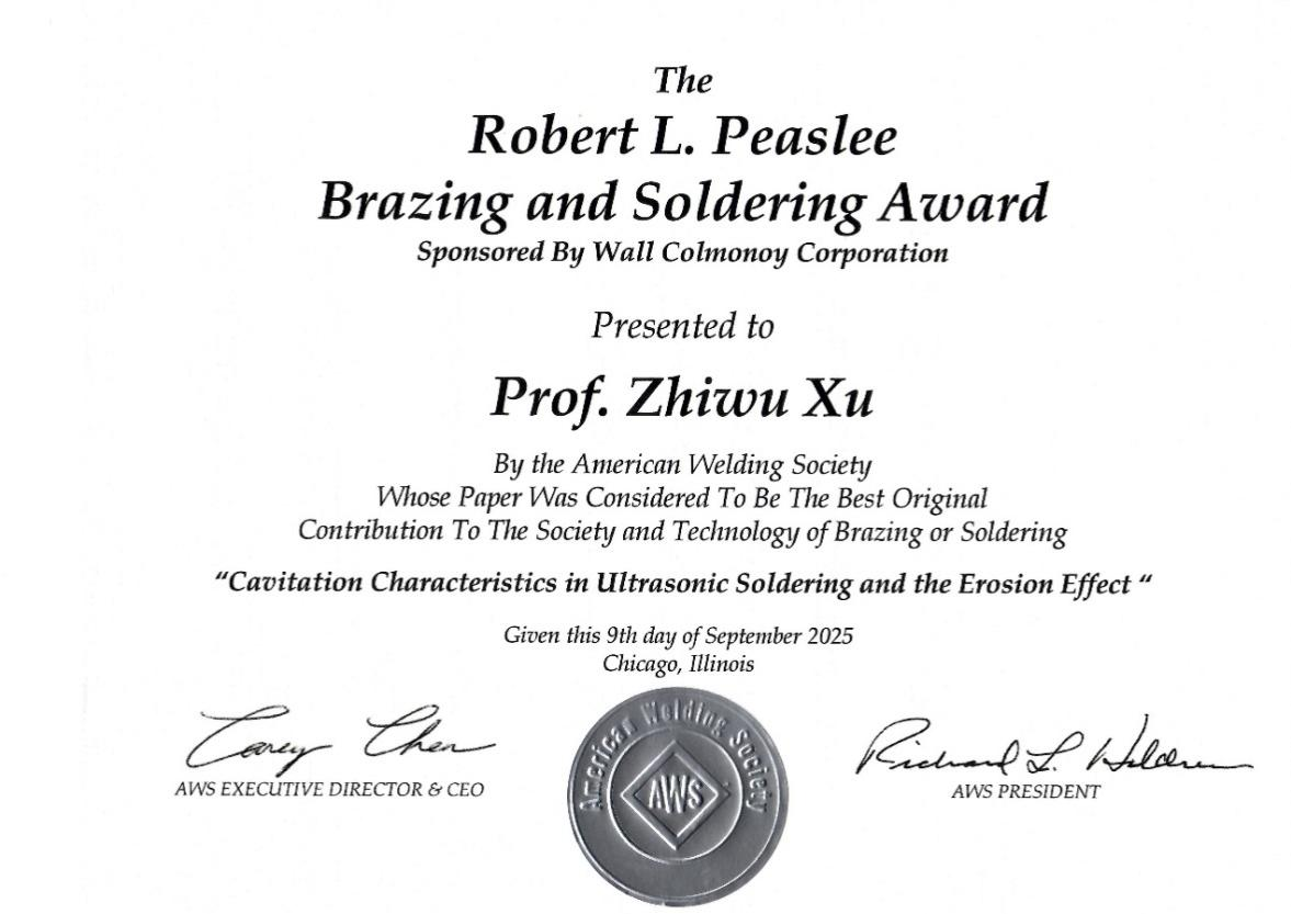 近日,材料结构精密焊接与连接全国重点实验室许志武、闫久春教授团队凭借在超声波钎焊领域的突破性研究,荣获美国焊接学会(AWS)2025年度“Robert L. Peaslee Brazing and Soldering Award”。这Y已是该团队第三次斩获该奖项,再度获得国际焊接权威机构的认可,标志着我国在超声波钎焊基础理论与应用研究方面持续保持国际领先水平。